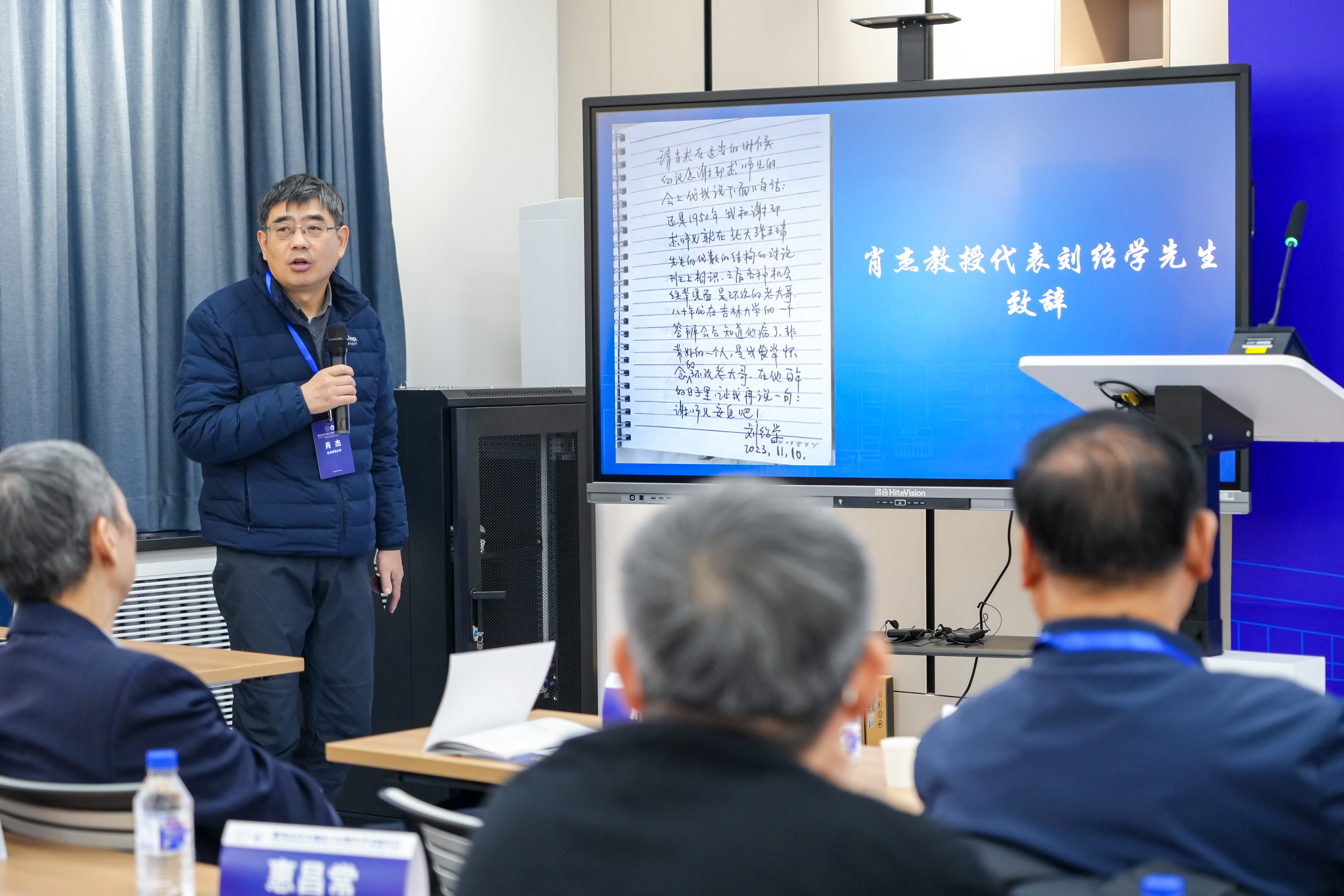 北京师范大学肖杰教授代表谢邦杰先生挚友刘绍学先生致辞,并深情诵读了刘绍学先生的手写信。刘先生在信中回忆了与谢先生相处的点滴过往,深切地缅怀了谢先生追求真理的奋斗精神、热爱教育的高迈情操以及矢志不渝的实践品格。
