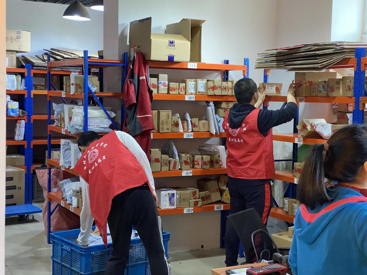 在快递站,志愿者们帮助叔叔阿姨按货架号找到快递交到同学的手中,给每一位取快递的同学带来热情的服务。人流量大的时候,志愿者还参与了帮助快递负责人卸快递、回答同学的需求、帮助同学扫码取快递等工作。
