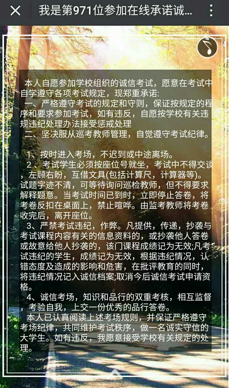 的同学定会恪守承诺,诚信考试,最终为自己一学期的学习生活交上一份圆满的答卷。