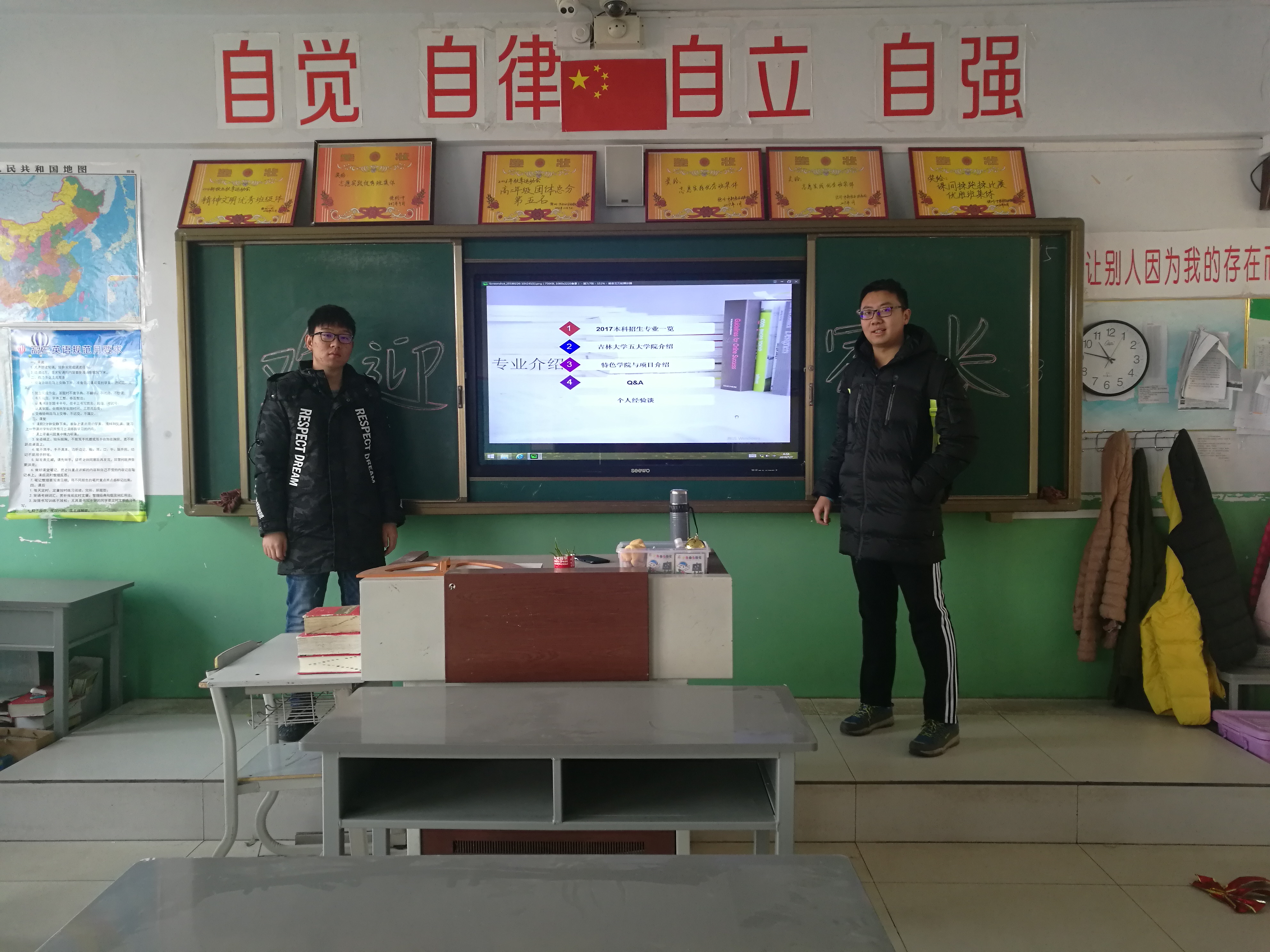 101612团支部在寒假期间分别派出三支宣讲队伍前往江苏省运河中学、山东省德州市第一中学、河北省保定市第一中学进行宣讲。宣讲队成员选择了形式丰富的宣讲形式。队员们首先通过发放宣传单、张贴海报等形式让同学们对我校有了一定了解并激发了同学们对我校的兴趣。在正式宣讲的过程中,队员们提前准备好了PPT、视频等资料,即使现场突发状况无法使用PPT,也利用投影仪将手机中的吉大美景放给大家看。队员们从禁漫天堂下载