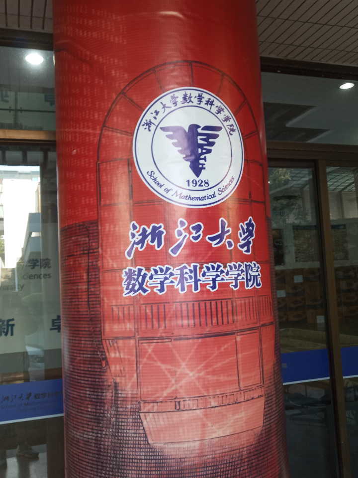首先,我们参观了永谦数学大楼即浙江大学数学科学研究中心,它由浙大校友汤永谦先生和夫人姚文琴女士捐资建造。由国际知名数学家,世界数学最高奖“菲尔兹奖”获得者丘成桐先生担任研究中心主任。步入大楼,各色各样的海报宣传栏吸引了我的注意力,内容大致是世界大学生数学竞赛中浙大学子的获奖情况,数学研讨会的召开事宜及基础数学知识的普及。走上二楼,一窥办公室门口的名片,便是丘成桐教授的办公室,但丘老先生定是不在办公室里的了。然后,我们小组参观了浙江大学高等数学研究所,在其中遇见了多位白发苍苍,颇有儒雅之气的老前辈,但我一行人眼拙,怕不是错过了好些数学研究的大方之家。之后,我们前往了浙江大学数学科学学院所在大楼,楼梯间均是国内最优秀数学家的宣传海报,在楼内遇见许多来来往往的年轻人们,将文件在办公室之间来回交递,他们大抵便是这新一代的数学研究者了。