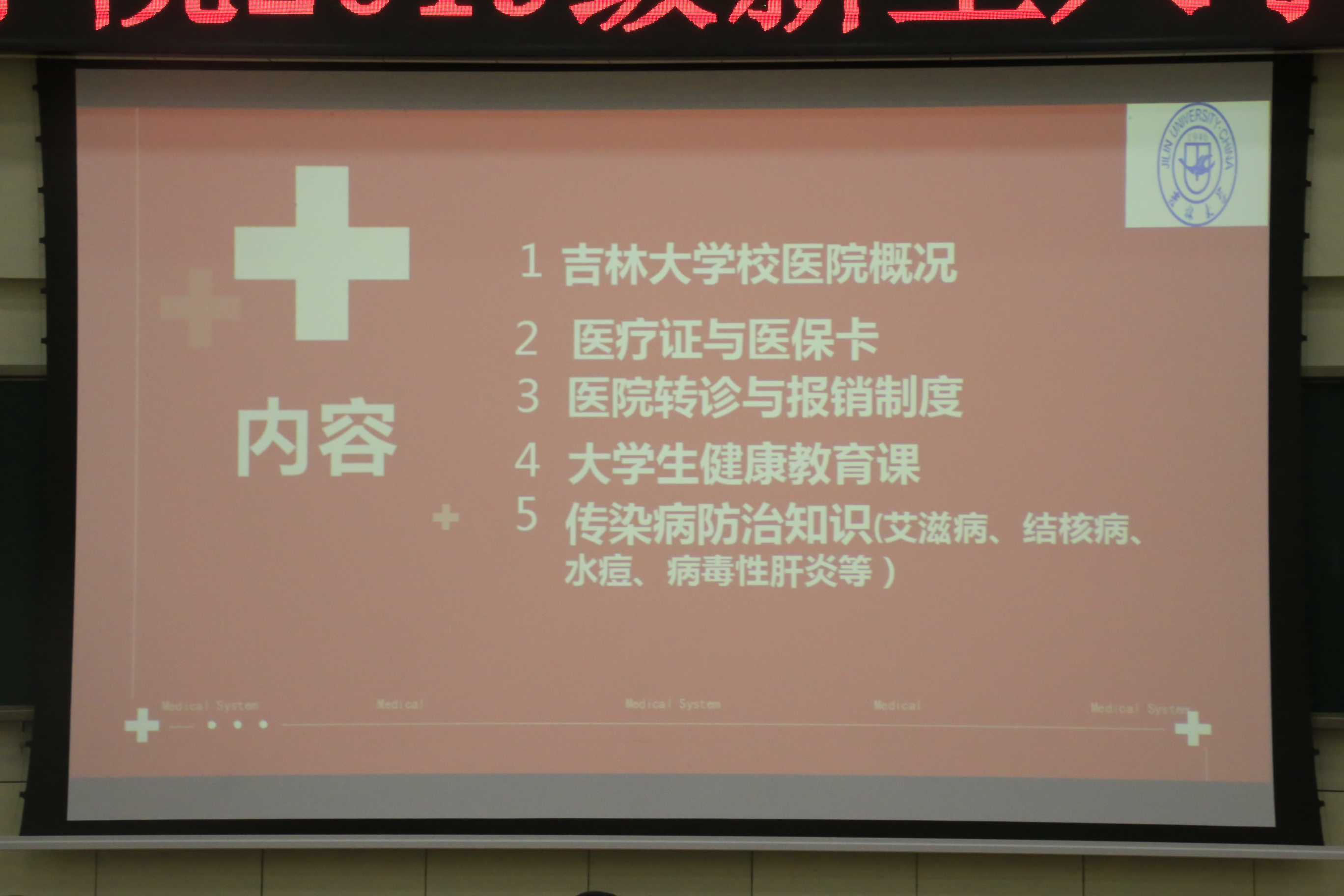 校医院的基本概况与职能,并且介绍了医疗证和医保卡的具体用途和优惠政策,以及介绍了学生发生意外时的医院转诊和报销制度。其次,任老师介绍了新生同学们即将学习的的大学生健康教育课,解释了学习这门课程的目的和意义。最后,任老师介绍了一些常见的传染病及其传播方式,具体介绍了艾滋病、结核病和水痘等的预防、发现和诊断,并面向大多数学生群体,针对常见传染病的知识误区,作出了详细的解释与纠正。