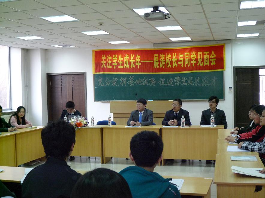 4月11日下午,校长展涛来到我院与09级基地班同学进行了以“充分发挥基地优势,促进学生成长成才”为主题的座谈。展涛校长与同学们一起讨论了关于大学生活、学习情况等与同学们息息相关的话题,并对同学们提出了“打好基础”、“经常交流”、“树立信心”等希望。