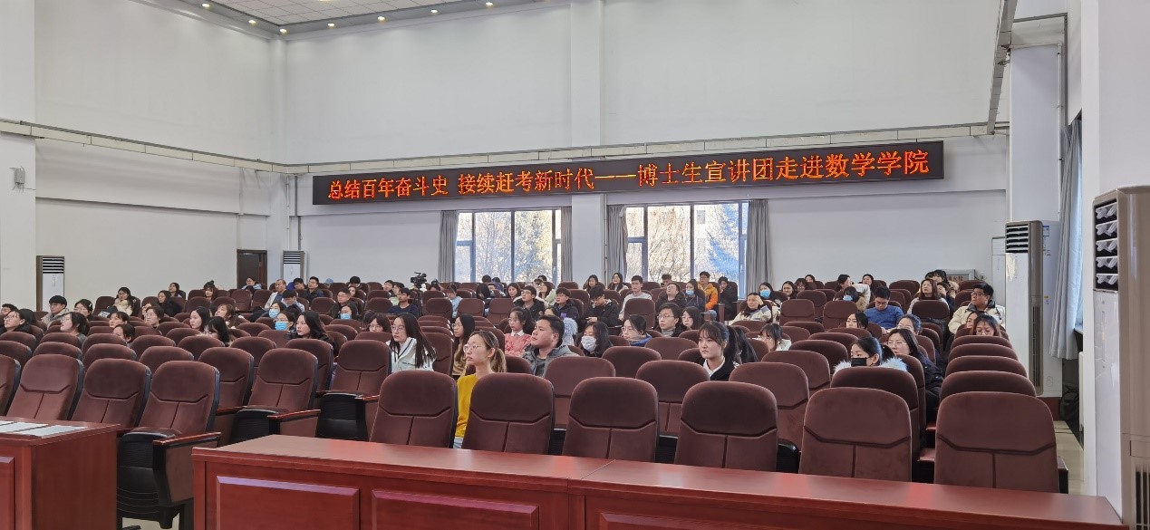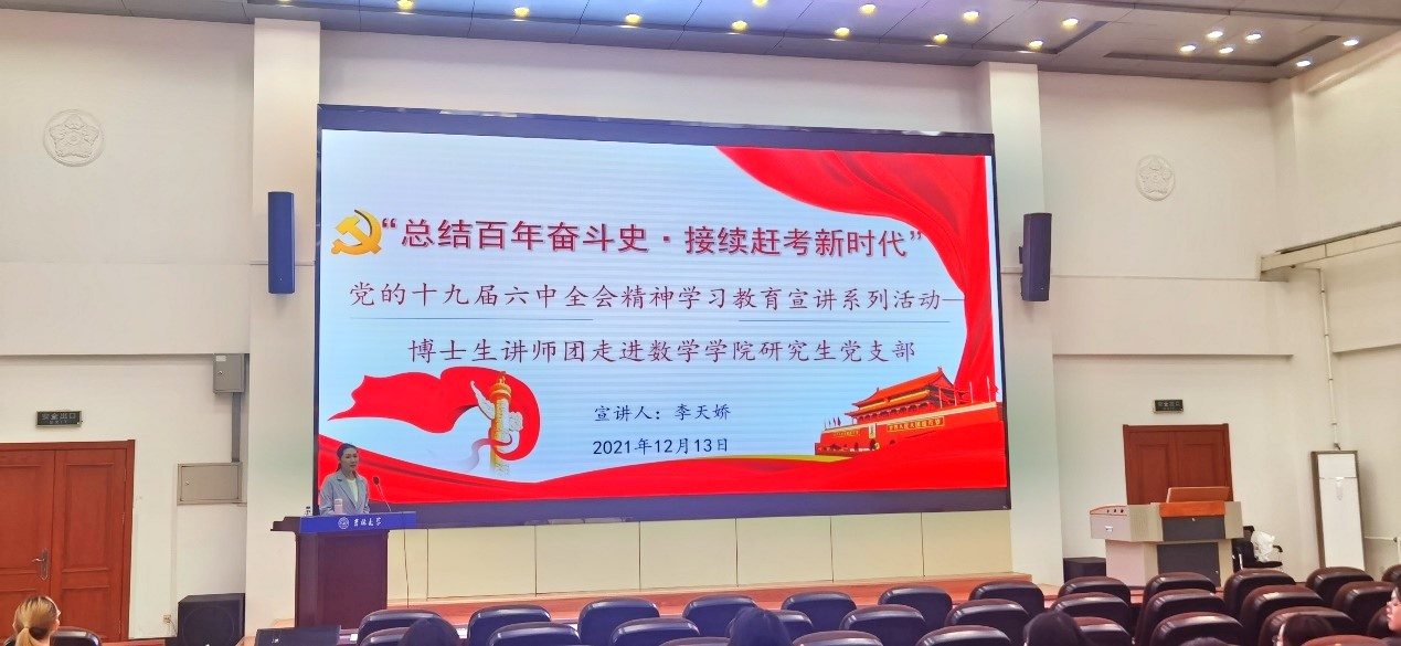 博士生讲师团讲师李天娇博士于数学楼二楼报告厅进行了十九届六中全会精神学习教育宣讲。本次宣讲的主题为“总结百年奋斗史•接续赶考新时代”——新中国以来国家领导人新闻发布的机制演变与基本经验”,学院研究生党支部党员、预备党员、积极分子参与了此次宣讲活动。
