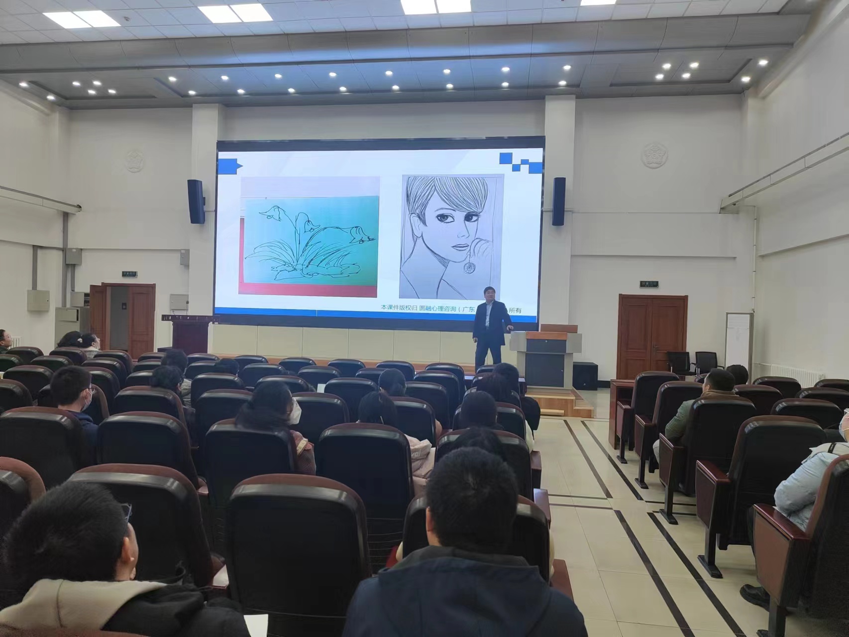 张老师首先分析了几幅来自不同人的画,结合他们自身环境分析得出其面临的心理问题。接着,张老师通过观察图片和同学们的状态,现场分析了同学们当前的压力指数和睡眠质量。最后张老师给出了一些解决负面情绪的方法:主动接纳负面情绪,正视自身情绪变化;将过度的情绪宣泄出去,保持心态平和 ;用积极的行动摆脱负面情绪。会后,张老师还与老师同学们进行了更加深入的探讨交流。