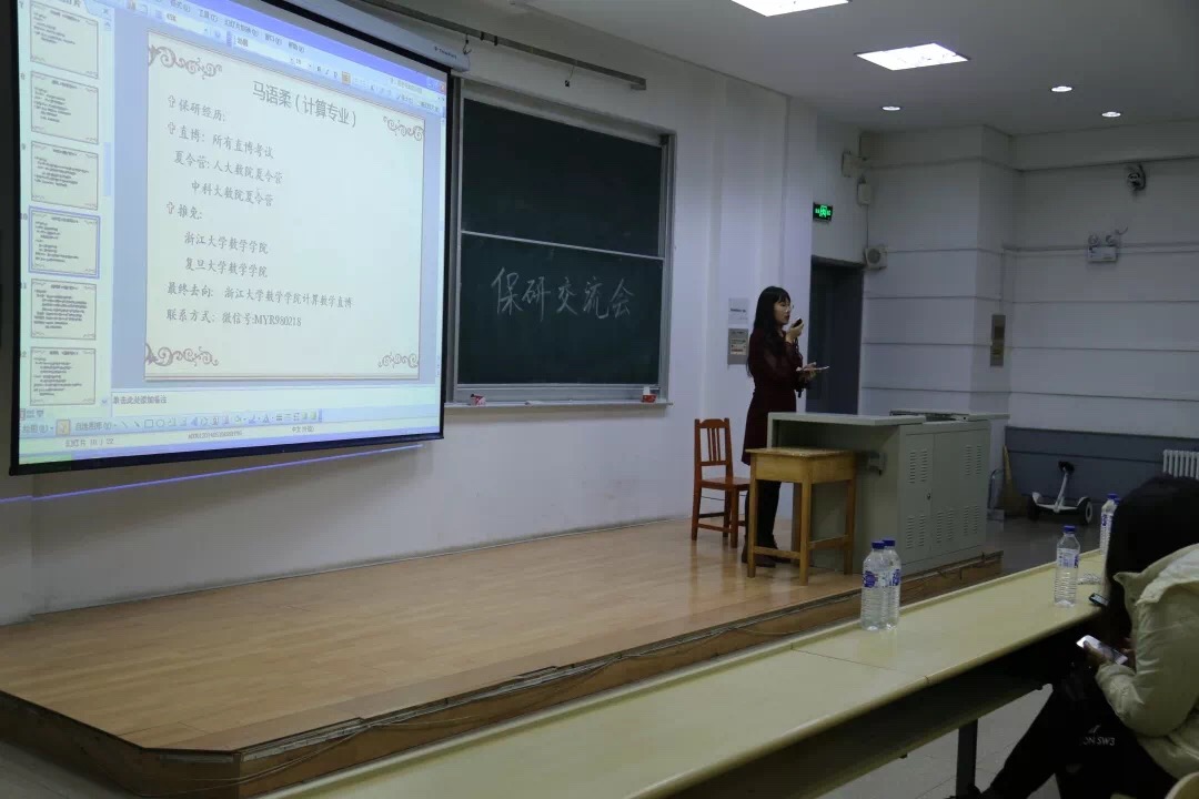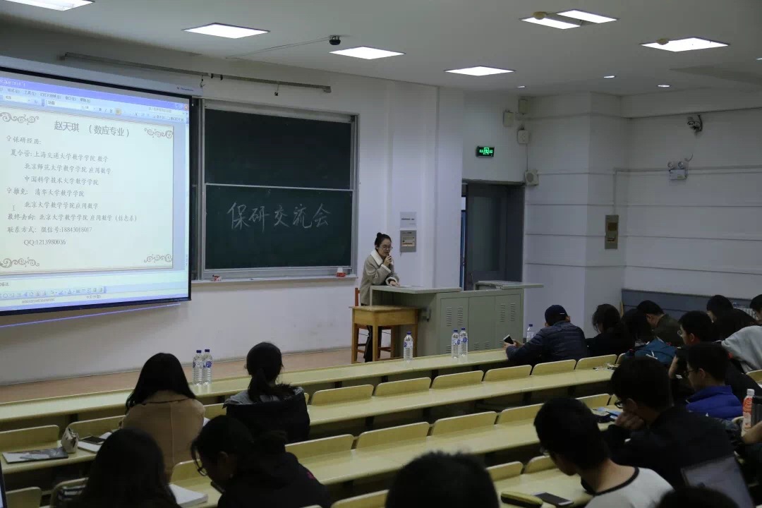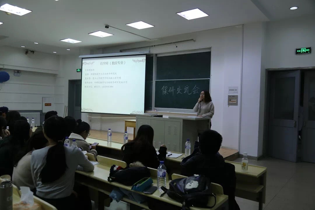 交流会伊始,石宇坷、赵天琪、曾加、武哲宇、李海天、邵华璐、刘震、曾晨雨、马语柔、赵瑞琦、许棪、许佳雨、丁冠中、许学博14名保研同学分别从个人经历、保研材料准备、保研学校选择及面试注意事项等方面全方位、多层次地对保研问题进行讲解。武哲宇学姐向我们简述浙大,中科院,清华大学等学校的直博考试报名的流程,录取条件,注意事项等等,以及去中科院面试的经历,并且告诉我们在保研之前应选好自己的研究方向。直博中科院的石宇坷学姐也传授了许多报名中科大的经验,挑选导师的技巧,面试时的细节,导师会问的问题。来自金融数学的许学博学长则向我们分享了在金融数学专业对于出国和保研的看法,相比于出国留学,保研的压力相对小一些,多一次面试,就多一些胜算。许学长也向我们分享了他的保研题目,并且提醒我们写简历要小心谨慎,并且要表现最真实的自己,也要注意在面试时的姿态和形象等。刘震学长向我们分享了保研北大的经验,数分,高代,空解非常重要,需要好好准备,同时,本校老师的推荐信也非常重要。在夏令营要深度了解导师,不要自我设限,应该给自己准备一个大的方向。不要自我说服,不要孤军奋战,不要盲目自信,不要因小失大。许棪学姐向我们分享了北大数院统计学的笔试经验,以及需要准备英语自我介绍,要提高自己的英语能力。马语柔学姐分享了中科大夏令营,人大夏令营的时间,内容,她的面试经历等等,数分高代实变函数等等都需要好好准备,平时学习要认真打好基础。来自统计学专业的赵瑞琦学长也向我们分享了夏令营的考题,北大面试的内容和形式,自己科研项目的自我展示等。还有要注意期末考试时间是否与夏令营时间冲突等。签合约要谨慎,不要轻易违约等。参加其他学校的夏令营和九月推免的学长学姐也向大家分享了经验。