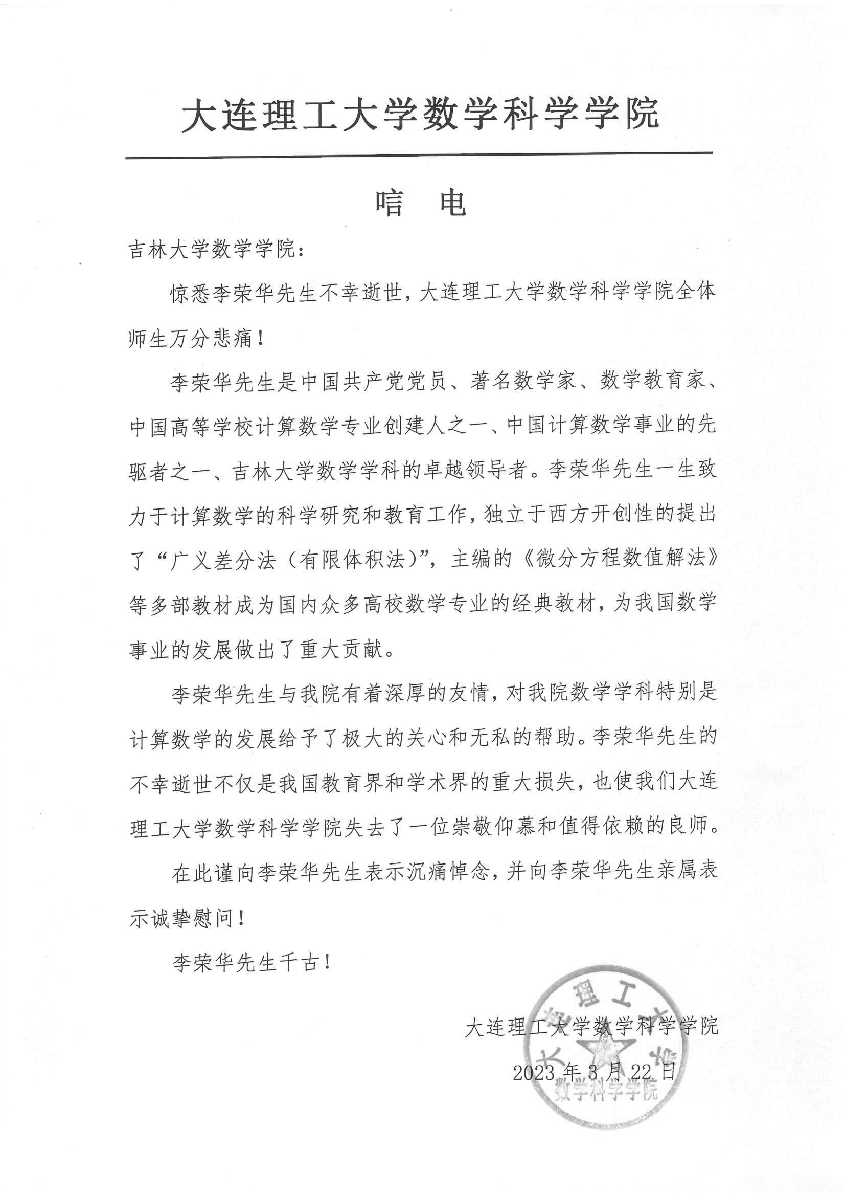 大连理工大学数学科学学院唁电