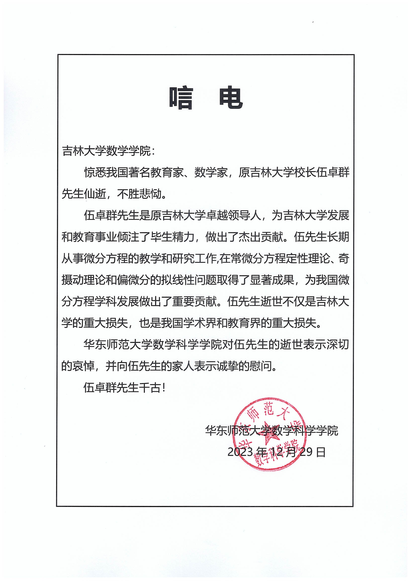 华东师范大学数学科学学院唁电