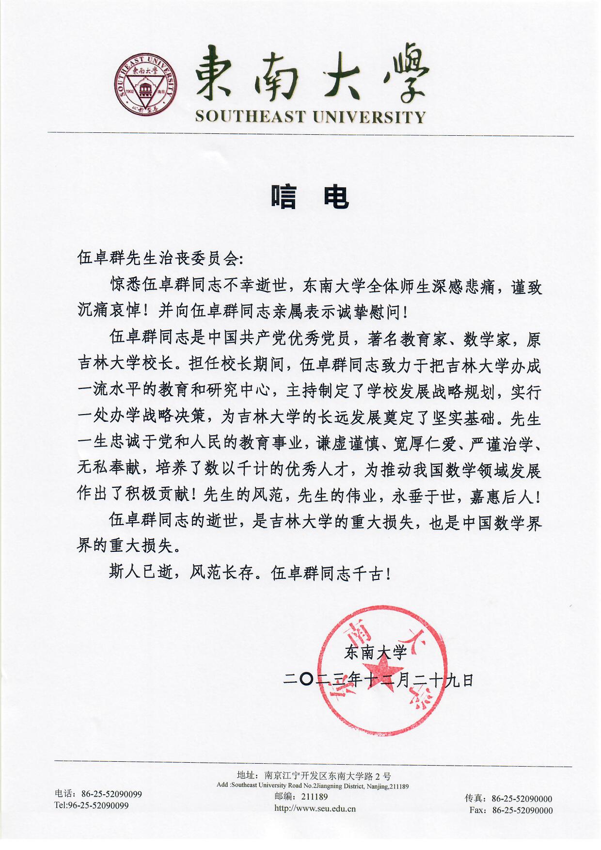 东南大学唁电