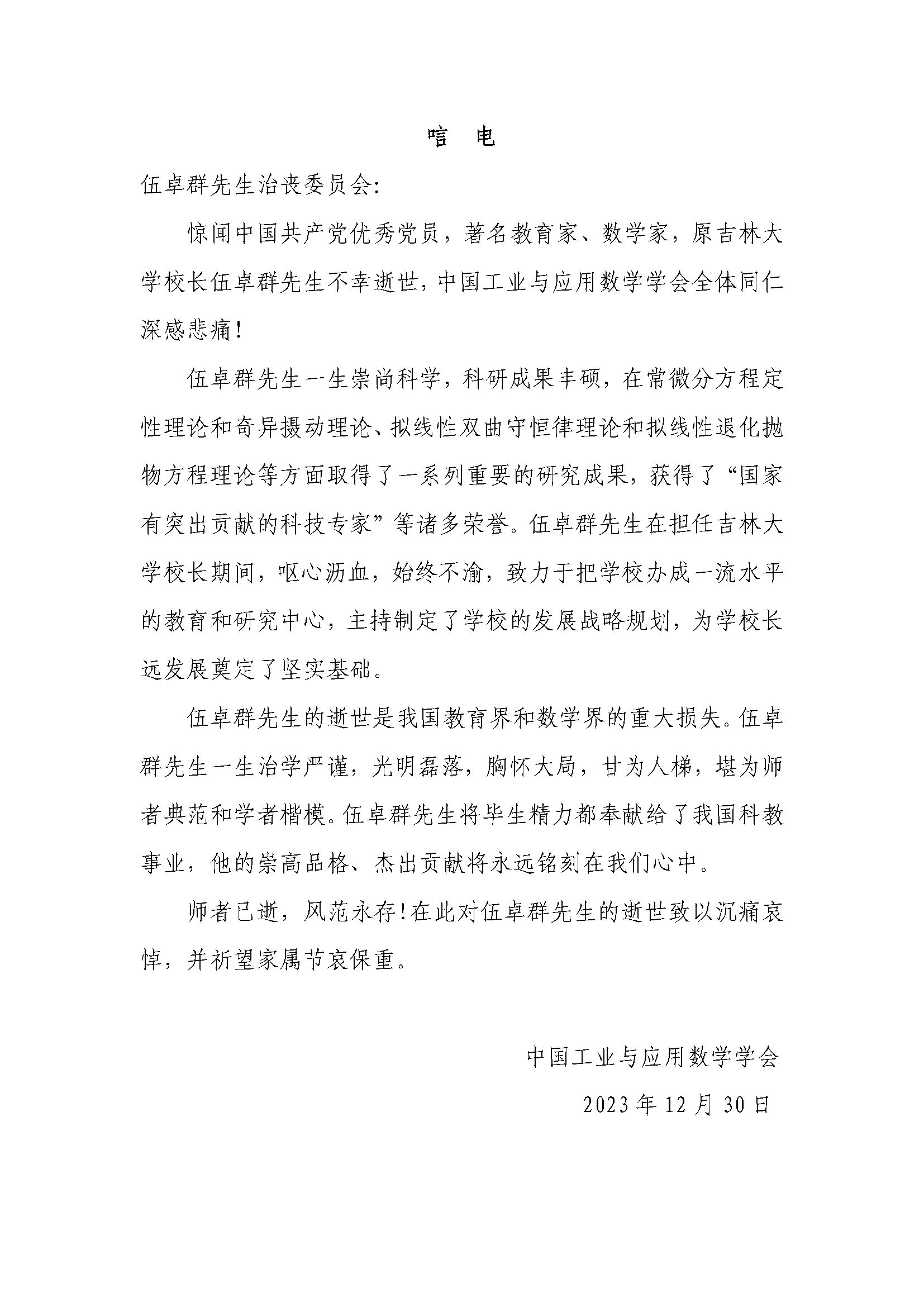 吉林省工业与应用数学学会唁电