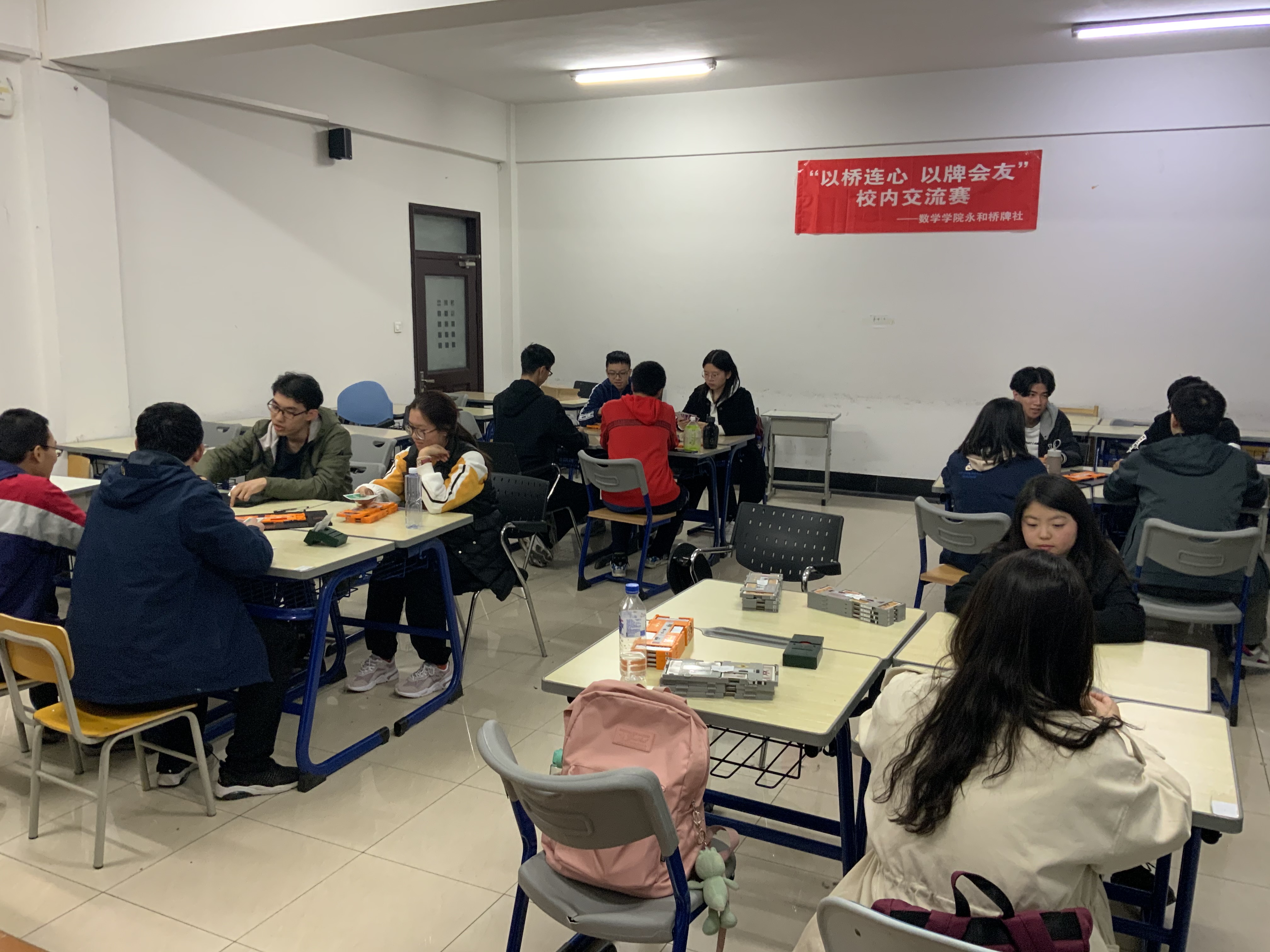 1017日下午1:30,禁漫天堂下载 永和桥牌社在经信教学楼A105教室举办了“以桥连心 以牌会友”校内交流赛,其中,参赛选手不乏来自我院的本科生、硕博研究生及其他学院的桥牌爱好者。此次比赛采用计分制,共制24副牌,七组队伍打完24副牌后比较最终得分,分高的队伍获胜。