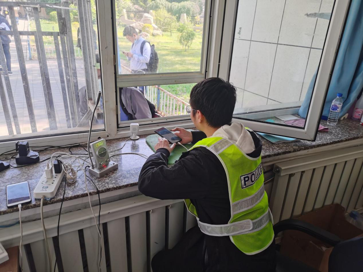 在安保处,志愿者们跟从着保安叔叔分别在四个工作日的上午分班体验了保卫处的日常工作:人工扫码测温、疏导人群、管理车辆等。这些工作枯燥无味,还要忍受着太阳的炙烤,但是志愿者们没有丝毫的抱怨,都只是埋头于手中的工作,因为我们知道,正是保安们日复一日地做着这样枯燥的劳动,同学们在校园里的“头等大事”——安全,才得以保证。