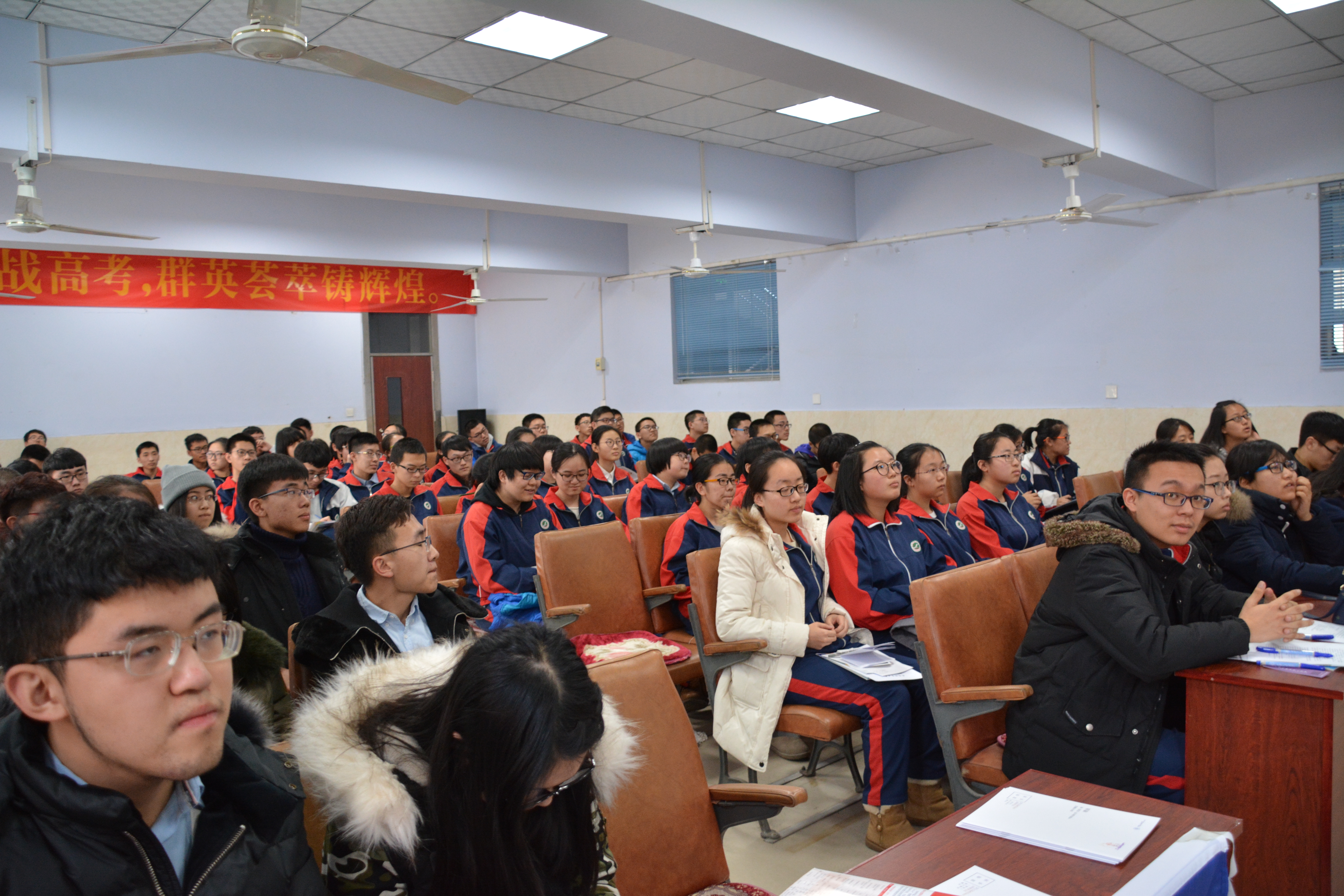的专业信息、自主招生要求等热点问题的资料。在得到校方领导的支持与欢迎后,小组成员们带着紧张与兴奋站上了宣讲台。宣讲结束后成员们一一地细心回答了学弟学妹们的问题。宣讲最后,张雯钰同学以吉大校训“求实创新,励志图强”与高三学子们共勉。宣讲圆满结束。