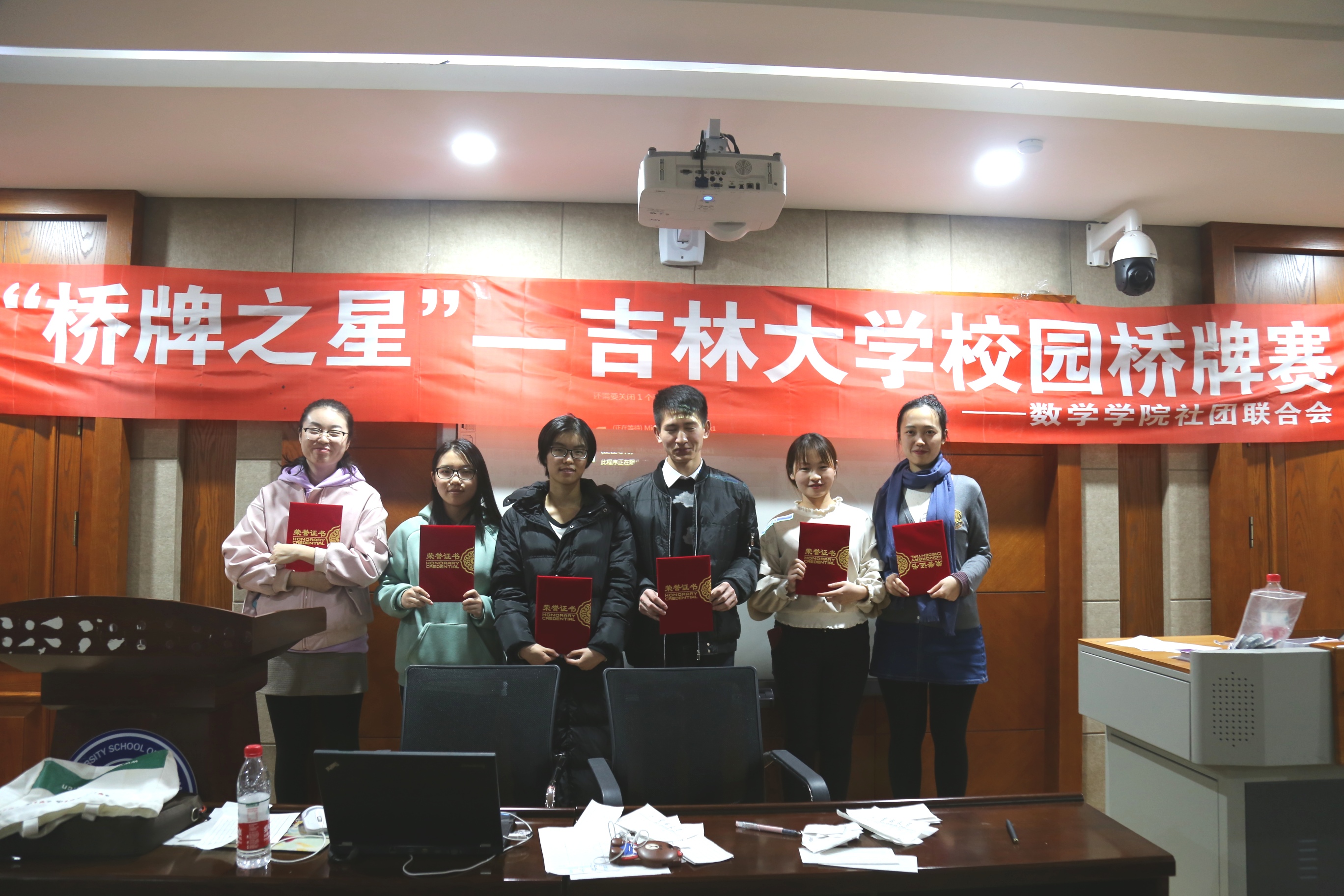 经过将近四个小时的激烈角逐,比赛结束。裁判裁决胜负后,由评委长春市桥牌协会副主席姚连钰为获胜者颁发礼品,为参赛者颁发证书。“牛刀小试组”一等奖由吴林浩同学,彭颜德同学获得,“大显身手组”一等奖由刘溯,王志铭同学获得。