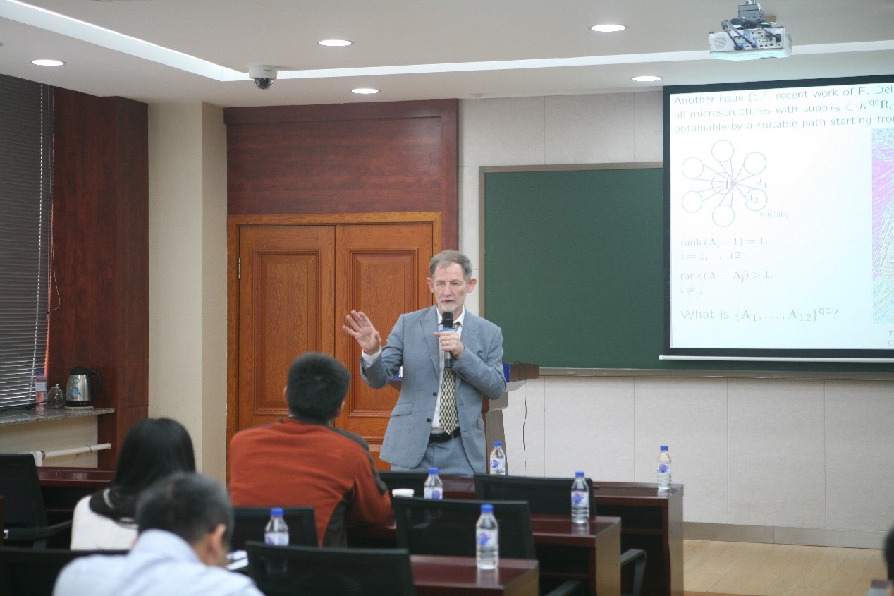 研讨会中,John Ball教授以“Polycrystalline Microstructure”为题作了特邀报告,主要讲解了“多晶和多晶缺陷的定义、边界条件的选取、缺陷的形成,以及温度对多晶体缺陷的影响”等内容,并提出了相邻颗粒之间缺陷结构是由界面边界条件引起的结论。随后,我校理论化学研究所吕中元、北京大学张磊、西藏大学小巴桑次仁、清华大学胡煜成,北京大学翟起龙、西藏大学拉巴次仁围绕“数学与液晶交叉相关问题”依次作了学术报告。
