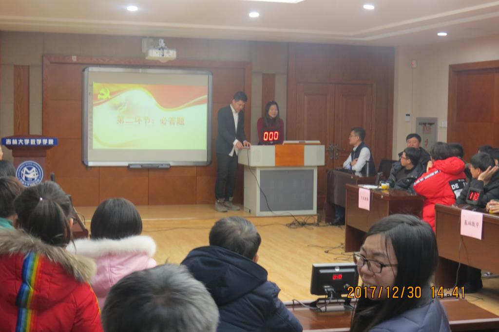 为了更好地学习宣传好党的“十九大”精神,进一步深刻领会习近平同志新时代中国特色社会主义思想,学院以“赛”促“学”,12月28日下午在数学楼一楼报告厅,学院党委组织开展了“不忘初心 牢记使命----十九大专题知识竞赛”,7个教工党支部代表队和1个民主党派代表队参赛。