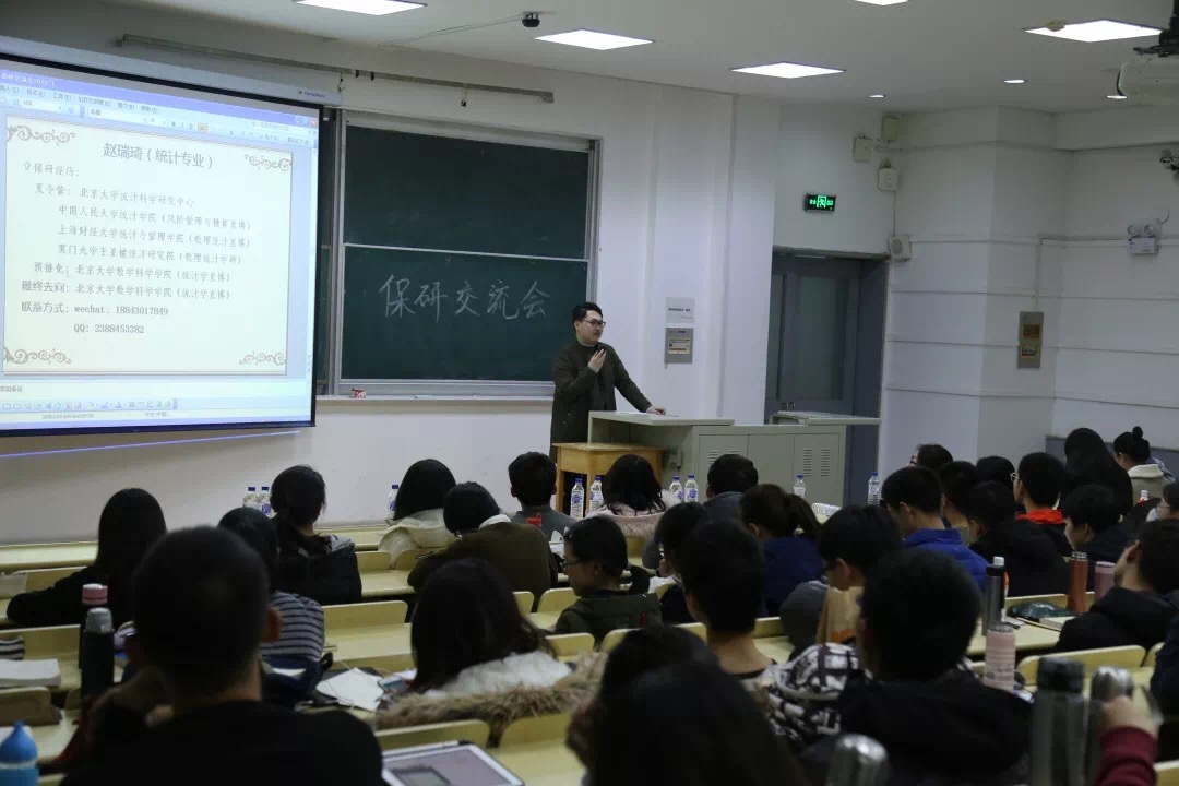 交流会伊始,石宇坷、赵天琪、曾加、武哲宇、李海天、邵华璐、刘震、曾晨雨、马语柔、赵瑞琦、许棪、许佳雨、丁冠中、许学博14名保研同学分别从个人经历、保研材料准备、保研学校选择及面试注意事项等方面全方位、多层次地对保研问题进行讲解。武哲宇学姐向我们简述浙大,中科院,清华大学等学校的直博考试报名的流程,录取条件,注意事项等等,以及去中科院面试的经历,并且告诉我们在保研之前应选好自己的研究方向。直博中科院的石宇坷学姐也传授了许多报名中科大的经验,挑选导师的技巧,面试时的细节,导师会问的问题。来自金融数学的许学博学长则向我们分享了在金融数学专业对于出国和保研的看法,相比于出国留学,保研的压力相对小一些,多一次面试,就多一些胜算。许学长也向我们分享了他的保研题目,并且提醒我们写简历要小心谨慎,并且要表现最真实的自己,也要注意在面试时的姿态和形象等。刘震学长向我们分享了保研北大的经验,数分,高代,空解非常重要,需要好好准备,同时,本校老师的推荐信也非常重要。在夏令营要深度了解导师,不要自我设限,应该给自己准备一个大的方向。不要自我说服,不要孤军奋战,不要盲目自信,不要因小失大。许棪学姐向我们分享了北大数院统计学的笔试经验,以及需要准备英语自我介绍,要提高自己的英语能力。马语柔学姐分享了中科大夏令营,人大夏令营的时间,内容,她的面试经历等等,数分高代实变函数等等都需要好好准备,平时学习要认真打好基础。来自统计学专业的赵瑞琦学长也向我们分享了夏令营的考题,北大面试的内容和形式,自己科研项目的自我展示等。还有要注意期末考试时间是否与夏令营时间冲突等。签合约要谨慎,不要轻易违约等。参加其他学校的夏令营和九月推免的学长学姐也向大家分享了经验。