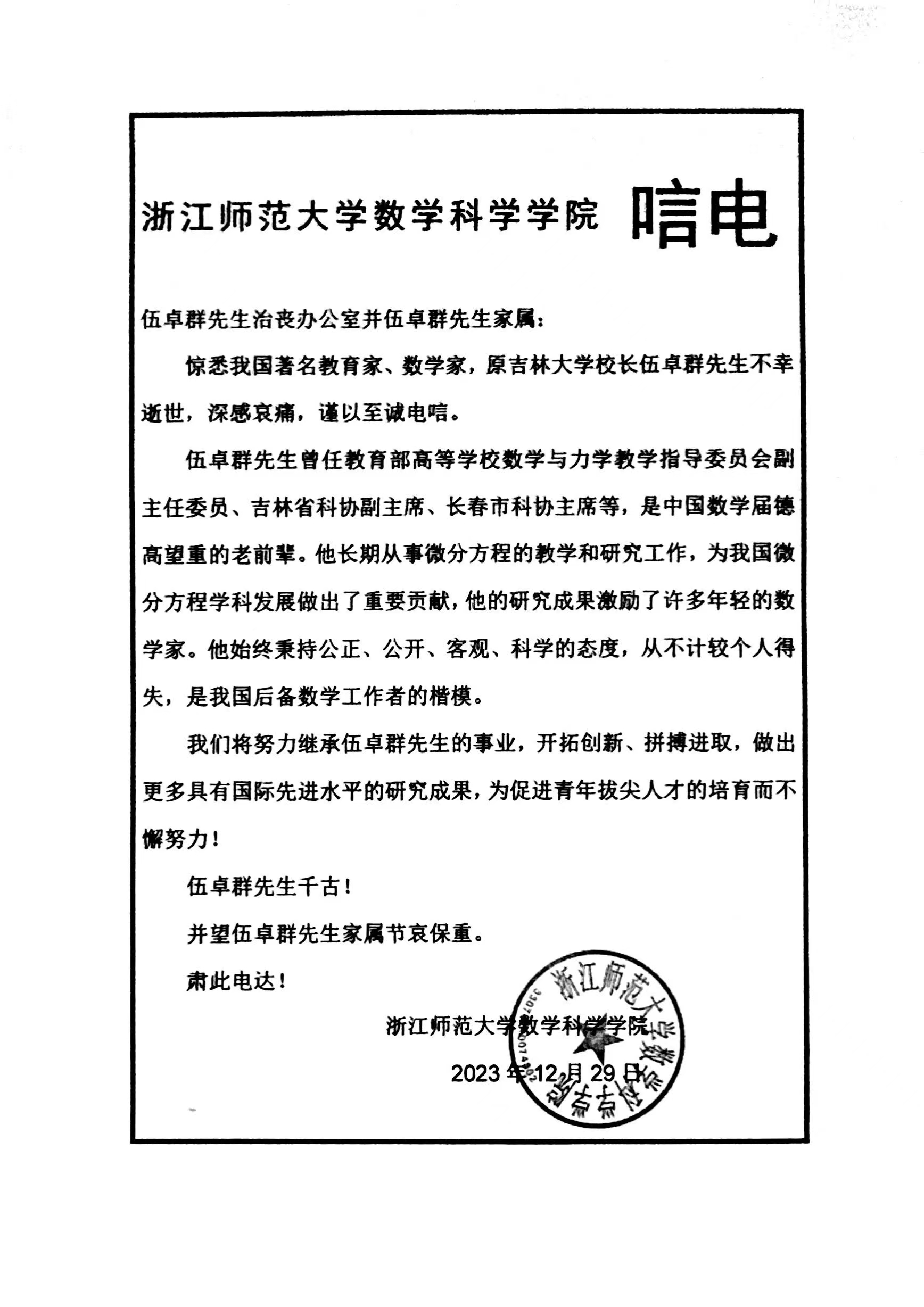 浙江师范大学数学科学学院唁电