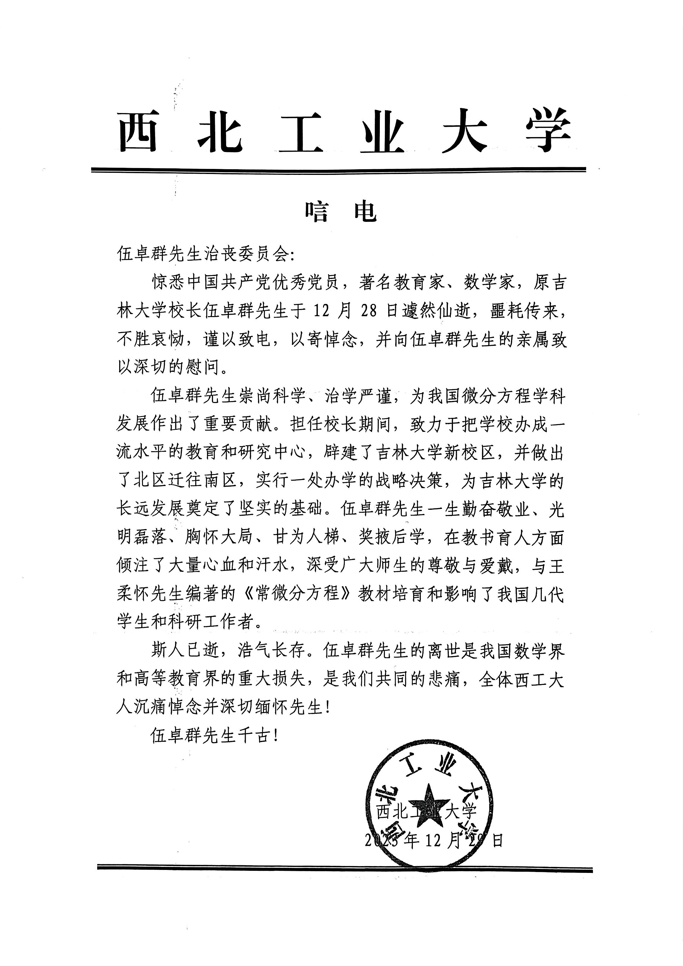 西北工业大学唁电