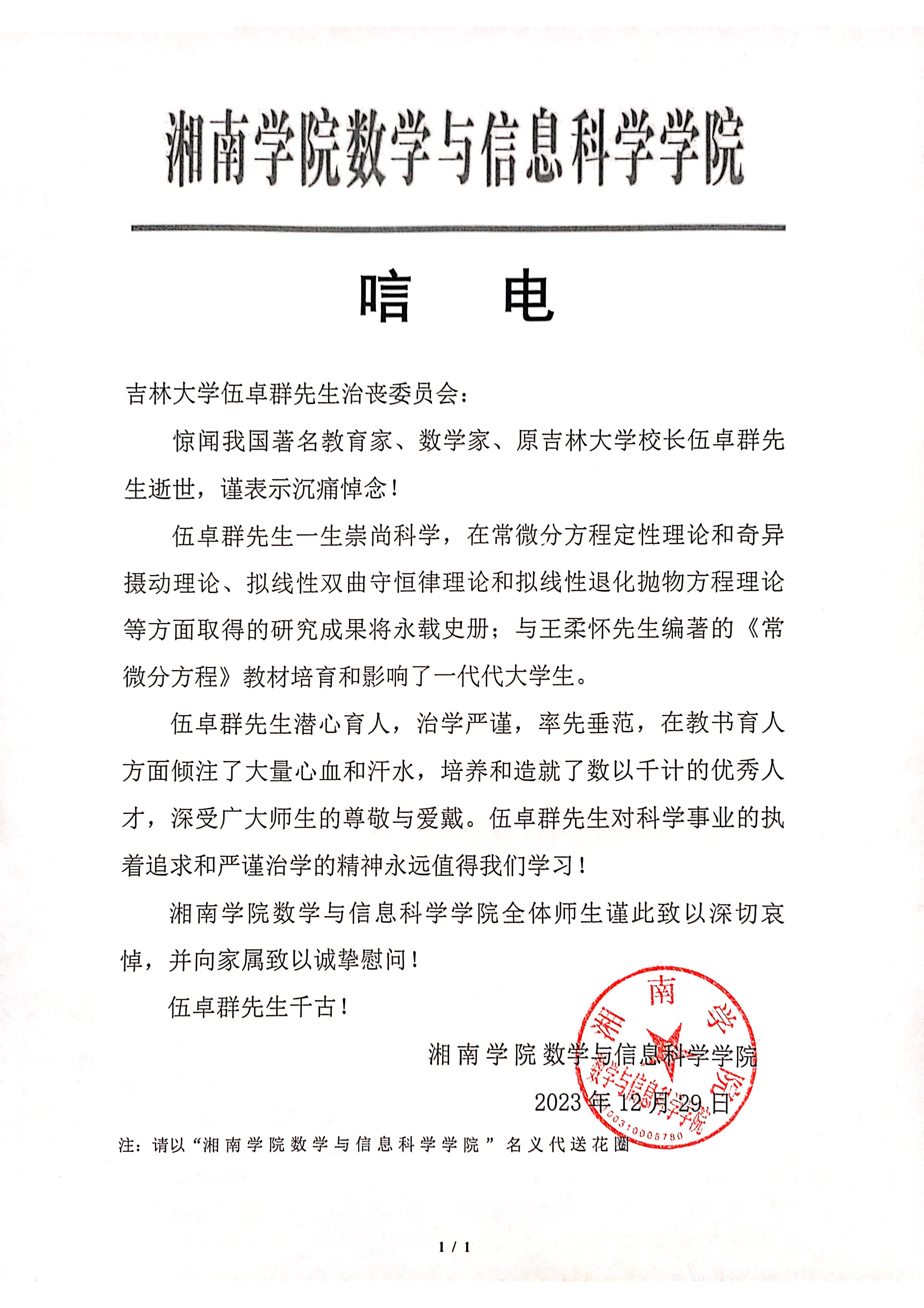 湘南学院数学与信息科学学院唁电