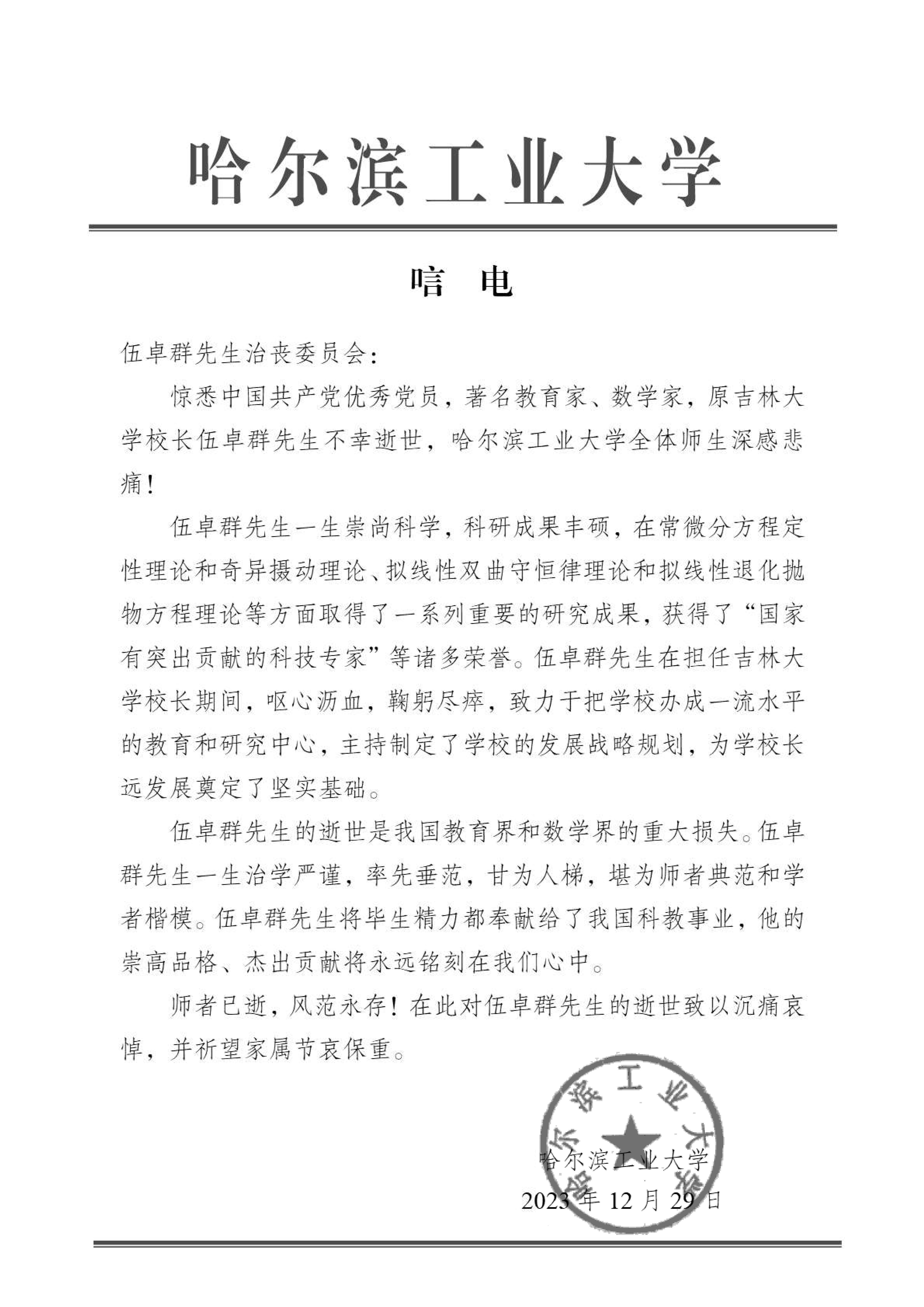 哈尔滨工业大学唁电